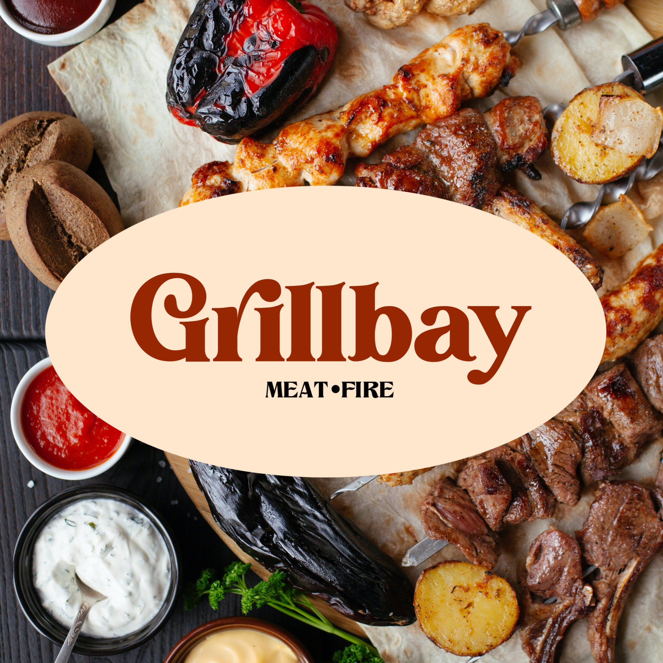 A restaurant branding project for GrillBay, exploring warm earth tones and bold, flame-inspired visual elements.
